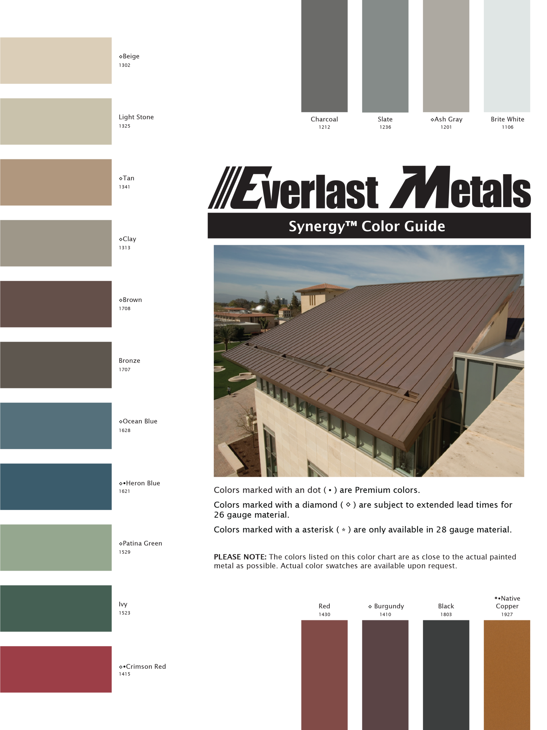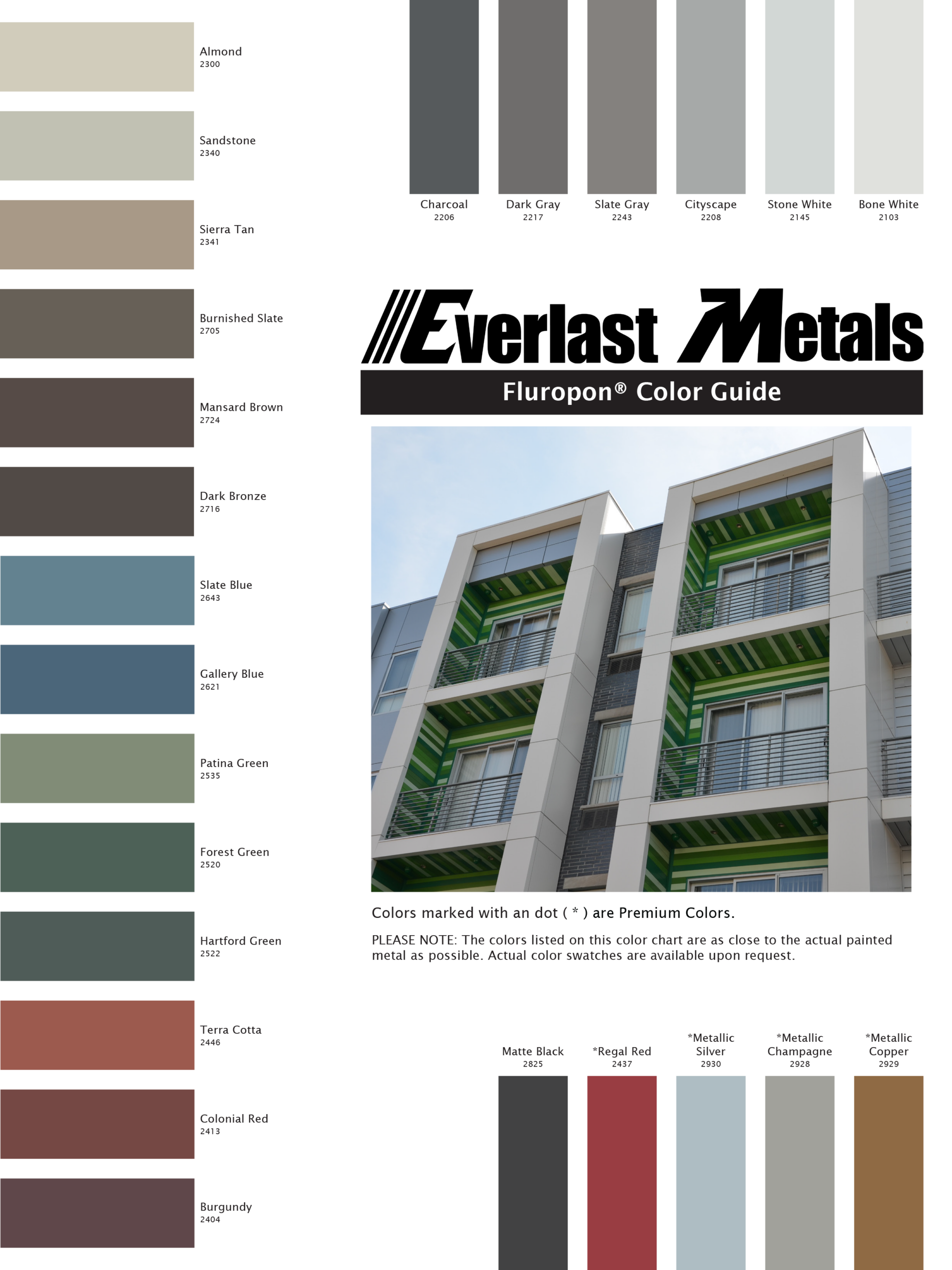 Color Chart PLEASE NOTE: DUE TO MONITOR DIFFERENCES, COLORS DISPLAYED MAY VARY FROM ACTUAL METAL. CONTACT YOUR DISTRIBUTOR FOR PAINT SWATCHES BEFORE SELECTING A FINISH. Fluropon® Color Chart Synergy™ Color Chart